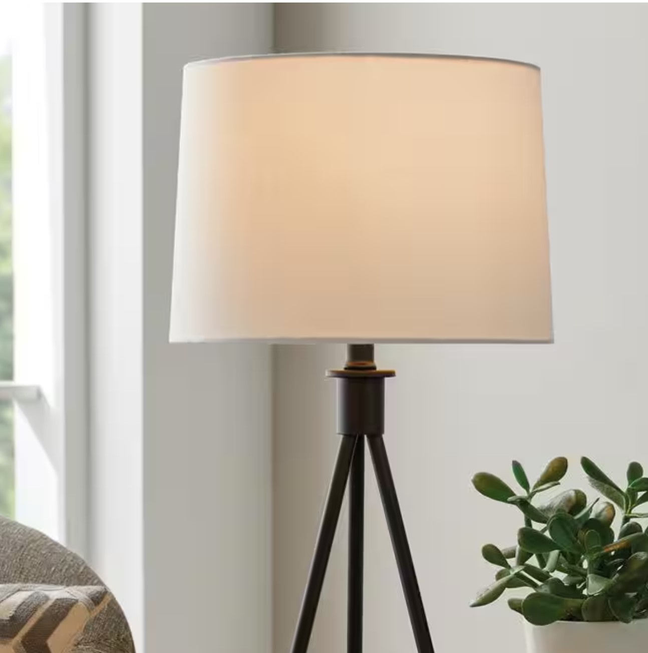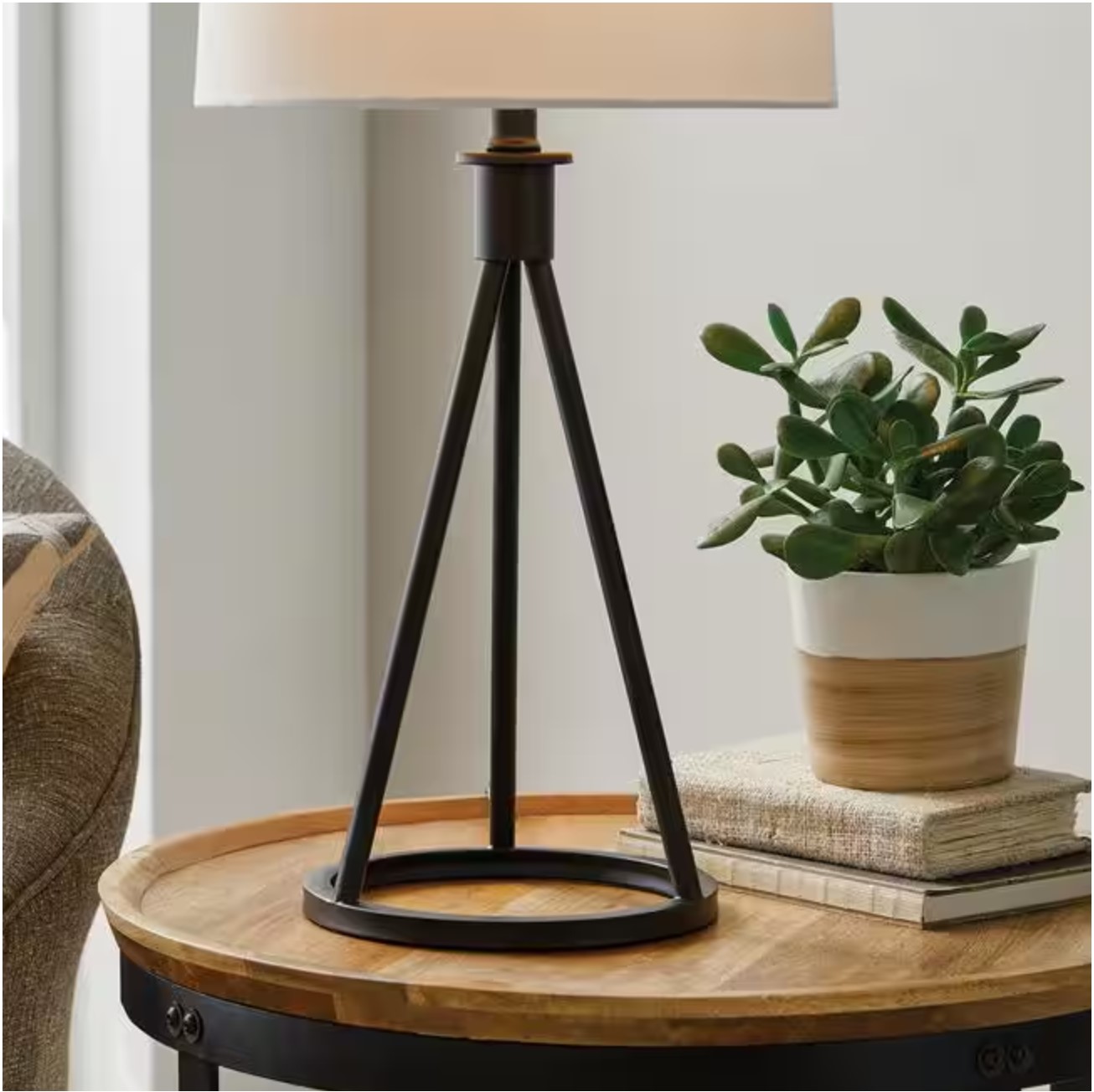 Add a touch of minimalist elegance to your home dรฉcor with the mid-century modern Hampton Bay 23.75 in. Metal Tripod Higgins Table Lampโa stylish and functional lighting solution that effortlessly combines contemporary aesthetics with practical features. Designed with a sleek black satin metal finish, this lamp features a visually striking tripod base that offers both stability and a light, airy presence. The modern silhouette is complemented by a crisp white linen drum shade that diffuses light evenly, creating a warm and inviting atmosphere in any room. Perfect for bedside tables, desks, entryways, or living room end tables, this lamp enhances your space with its refined design and soft ambient glow.